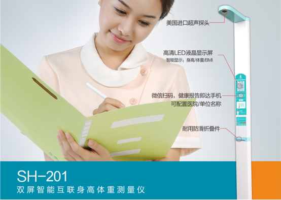 SH-201型雙屏智能身高體重測量儀是傳統(tǒng)數(shù)碼管身高體重測量儀的升級款,彌補了數(shù)碼管體重秤顯示效果單一,語音播報生硬的缺點。傳統(tǒng)的數(shù)碼管語音播報為機器播報,較為生硬;而SH-201型雙屏超聲波身高體重測量儀則采用智能語音播報,播報語音更人性化;雙屏采用高清的LED液晶顯示屏,可智能顯示身高、體重、BMI指數(shù), 另一個屏幕可配置醫(yī)院或者使用單位名稱,同時測量結(jié)果可以微信掃碼,兼具廣告宣傳和微信吸粉功能,展示效果更好。而在定價上,幾乎等同于數(shù)碼管秤的價格,真正的做到了增值不加價,更多讓利給客戶。
