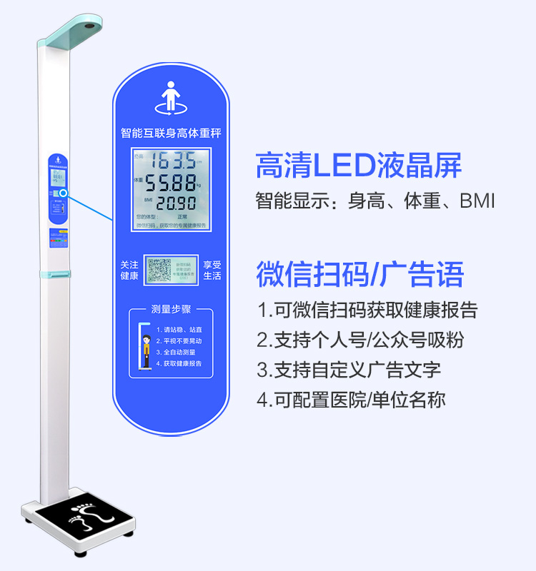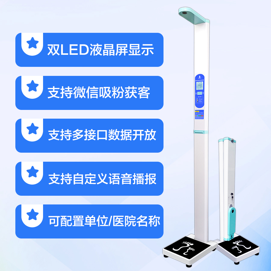 上禾SH-201智能雙屏身高體重測量儀,適合90%以上的春季體檢使用場景,雙屏顯示、可折疊、可設(shè)置您的專屬宣傳語、全自動測量、語音播報、數(shù)據(jù)傳輸?shù)龋胍墓δ埽加校?/p>